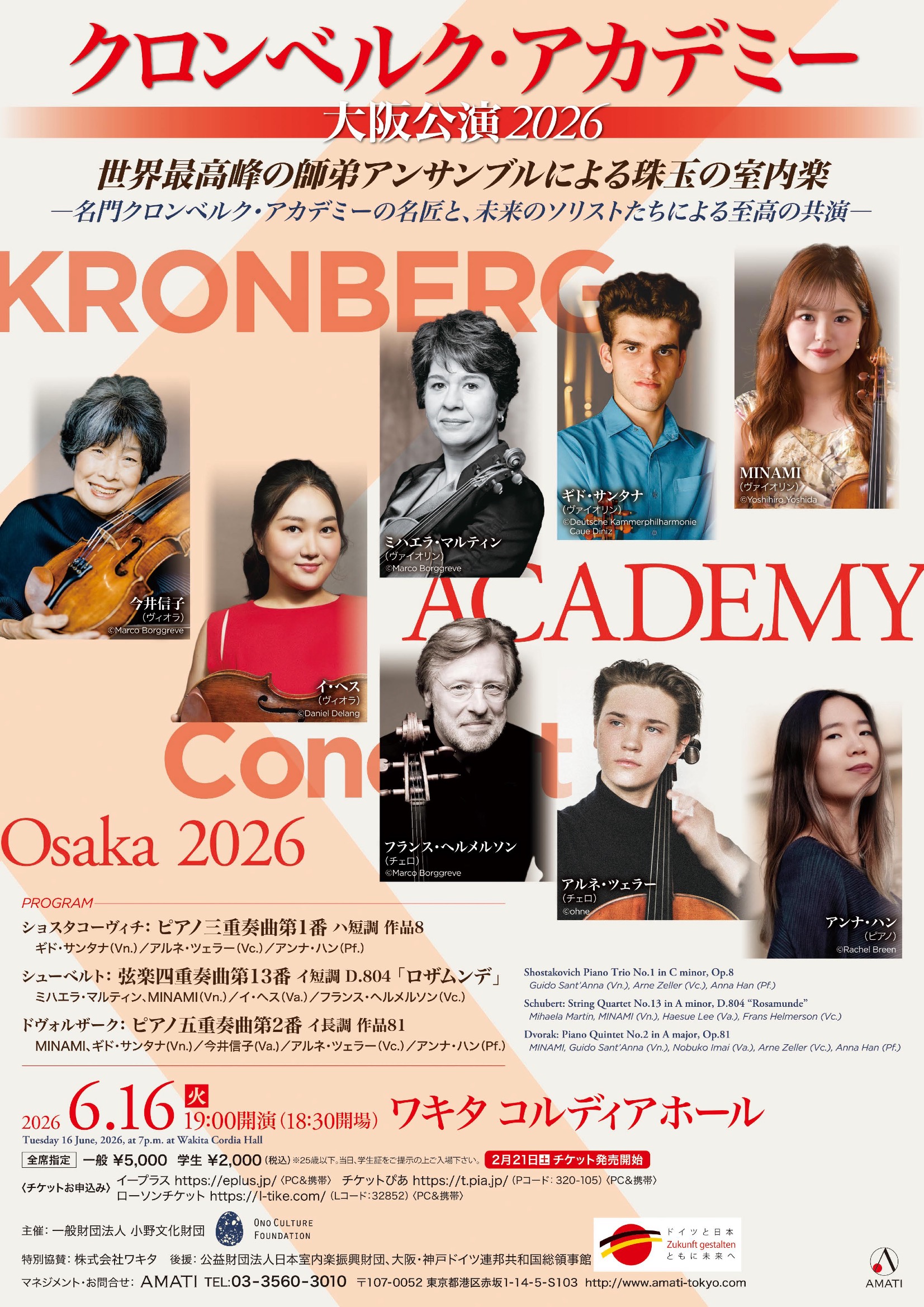 世界最高峰の弦楽教育機関として知られるクロンベルク・アカデミーの精鋭アーティストが大阪に集結。国際的に活躍する名手と次世代の才能が共演し、室内楽の醍醐味を存分に味わえる一夜をお届けします。
