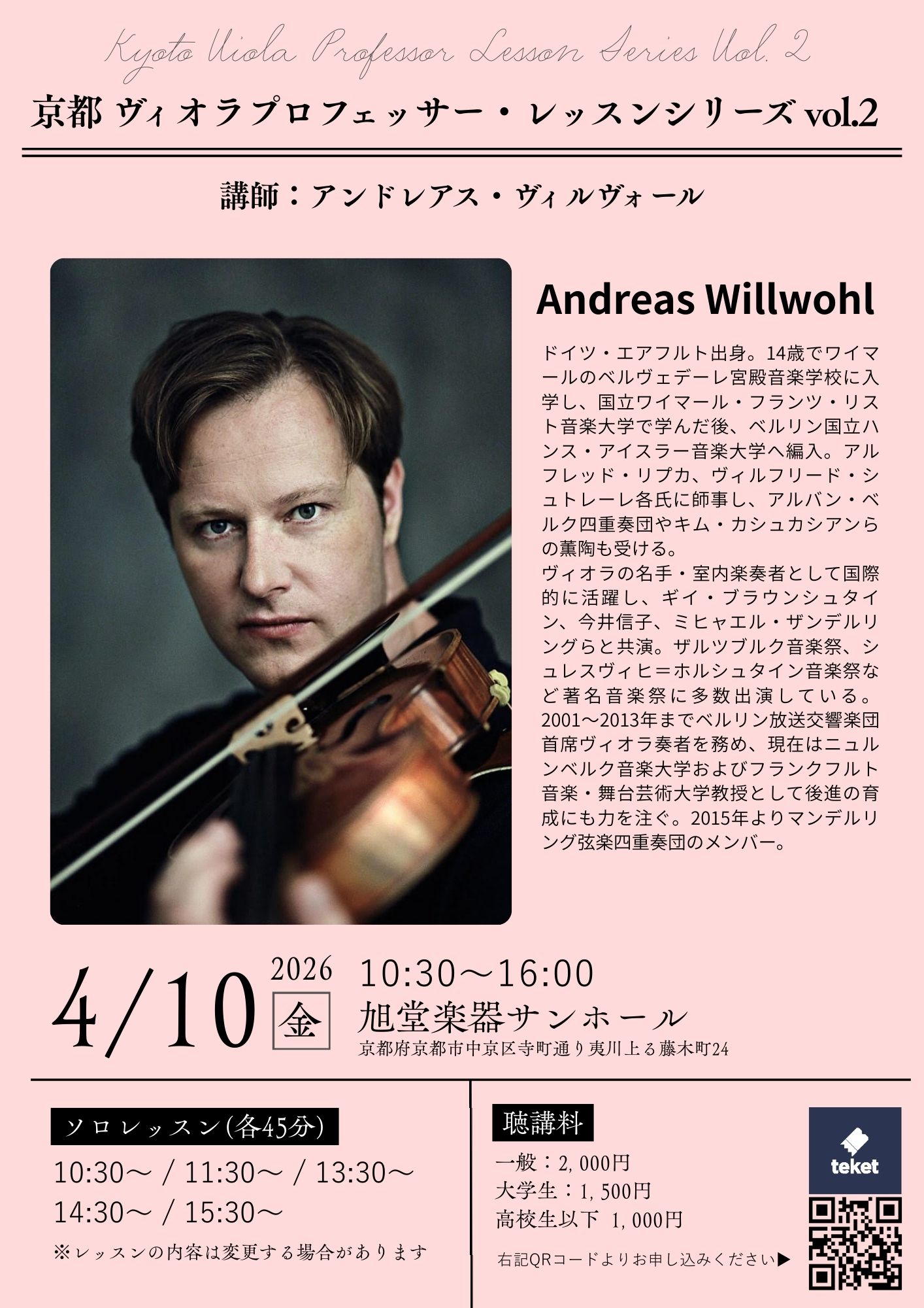 高校生以下:1,000円※当初予定されていたアンサンブルレッスンは行わず、ソロのみとなりましたことをご了承ください。